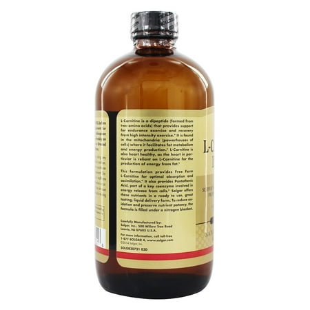 Solgar Liquid Drug Grade Free Form L-Carnitine Natural Lemon Flavor - 16 fl. Ounces [473 ml] Solgar L-Carnitine is a dipeptide [consisting of two amino acids] that supports endurance exercise and high-intensity exercise recovery. L-carnitine is present in mitochondria [cell power stations], which promote fat metabolism and energy production. Solgar L-Carnitine is also heart healthy because the heart is particularly dependent on L-carnitine